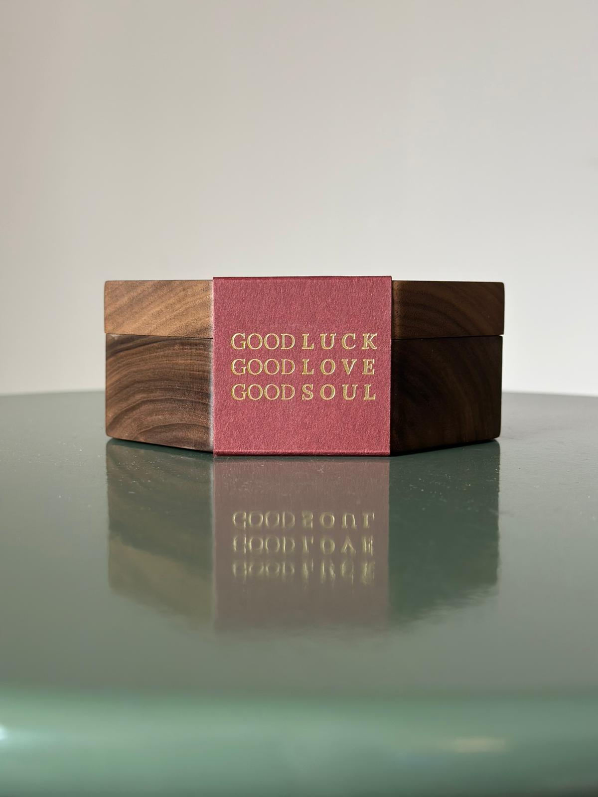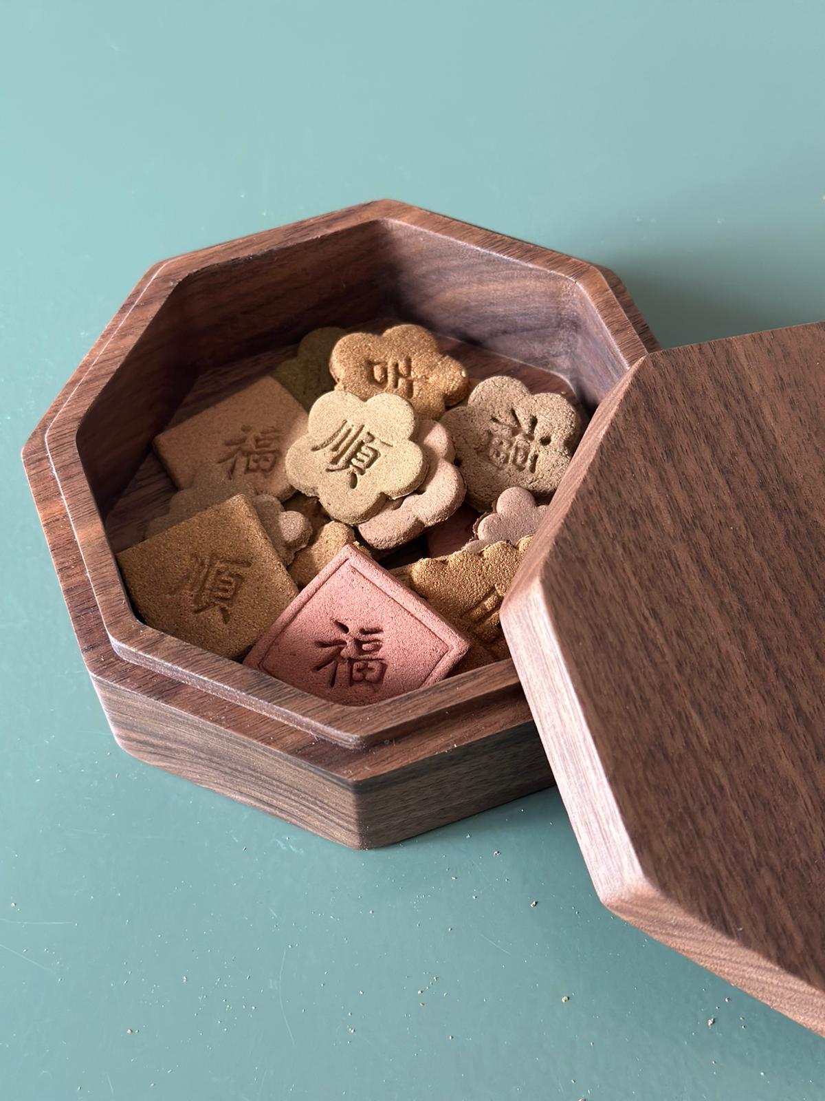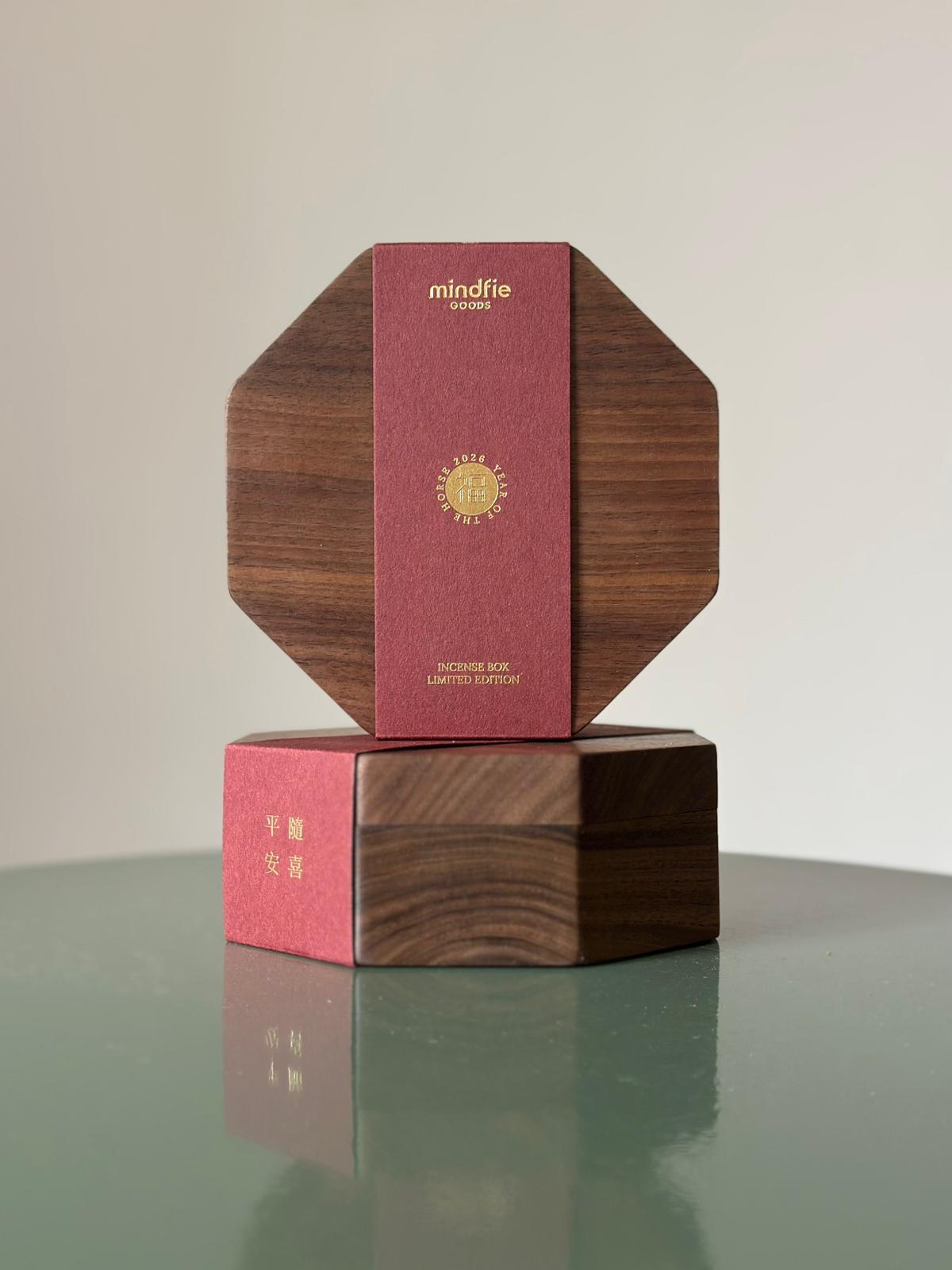 今年mindfiegoods首次推出祝福字語印香全盒,以香寄語。這個由實心胡桃木製成的盒子以八邊形設計,象徵著保護、健康和財富。八邊形在風水中是最旺財的形狀之一,一直被認為具有聚財的能量,因此擺放八邊形的物品在家中有助於提升財運,同時保持良好的能量。